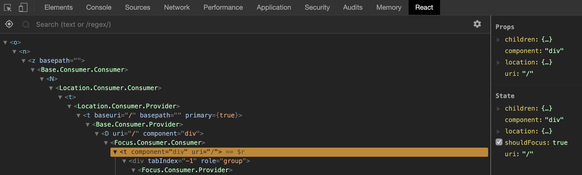 This extension allows you to inspect hierarchies of components in your React application. It works only for React and you can find it as a new tab in DevTools (called React). You can also check the props and state of the selected component. The really good thing is that if you select any element in the Elements tab in DevTools it will be also selected in the React tab, so you don't have to waste time to look for it twice.