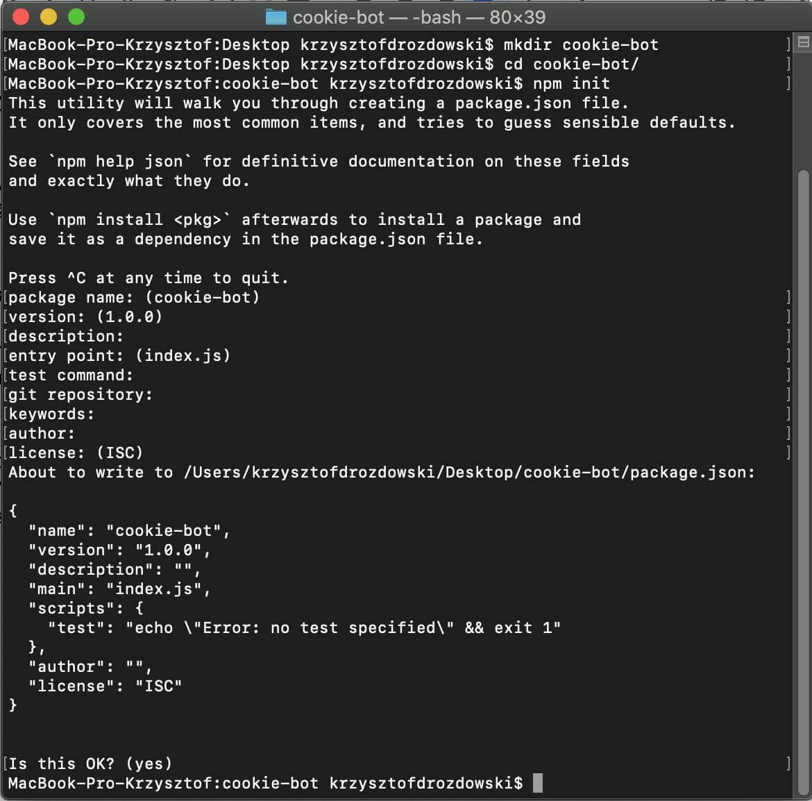 With a good editor, Node and npm, we are ready to initiate our project. How to do it? Very simply - we create a directory for our bot and use the terminal to enter the command npm init. It should look like this: