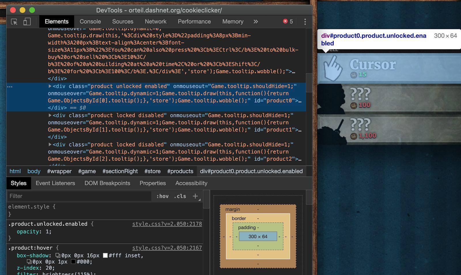 Do we want to buy these improvements ourselves? Of course not. It's a complete waste of time. We will have our bot do it! What connects all these improvements is the class - 'product'. As you can see, the things we can't buy have the 'locked' and 'disabled' classes. However, we are looking for those that we can buy - they have three classes: 'product', 'unlocked', 'enabled'. Let’s get them!