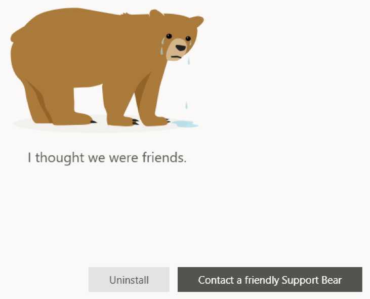 TunnelBear gives an endearing example of using microcopy in this case. When you want to uninstall it you will see a very upset bear. You may stay tough but most probably you will have second thoughts and at least consider clicking on a button ‘Contact a friendly Bear Support’. Because this poor bear is so sad, isn’t it?