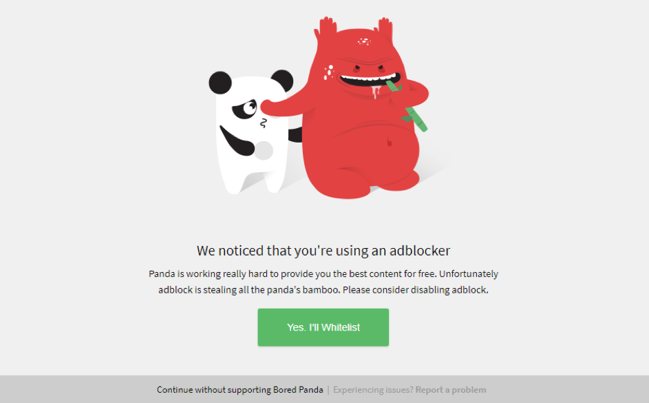 There are a few situations when you need to ask your users some questions that could possibly make them somewhat irritated. Asking for whitelisting your website on an adblocker is certainly one of them. If someone is using an adblocker, he won’t be eager to remove it and get bombarded with adds again. You’ll have to make a push to win this time. But if you come up with something creative and charming like the little Bored Panda in trouble…