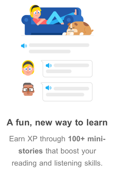 Did you launch a new brilliant feature in your app? Make sure that your users will get a line on it by sending them a catchy commo. Recently, when Duolingo introduced learning by mini-stories, they invited users to join the famous green owl Duo, then presented how the new learning method looks like in a nice, simple and attractive way: