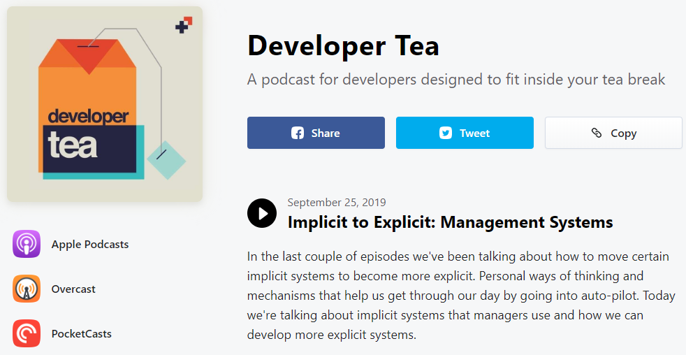 Made yourself a cup of coffee or tea? Good! Developer Tea is a podcast made just to fit in your break. The host, Jonathan Cutrell talks about topics related to both professional and personal growth as a developer, giving the listeners tips on self-improvement and better performance at work. Many topics are worth talking over later with your colleagues or friends. Real food for thought!