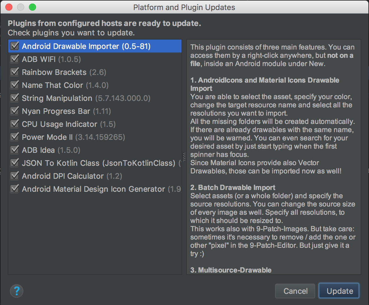 Platform and Plugin Updates: The following plugins are ready to update: JSON To Kotlin Class (JsonToKotlinClass), ADB Idea, Android DPI Calculator, Name That Color, CPU Usage Indicator, Android Material Design Icon Generator, Rainbow Brackets, ADB WIFI, Power Mode II, Nyan Progress Bar, Android Drawable Importer, String Manipulation