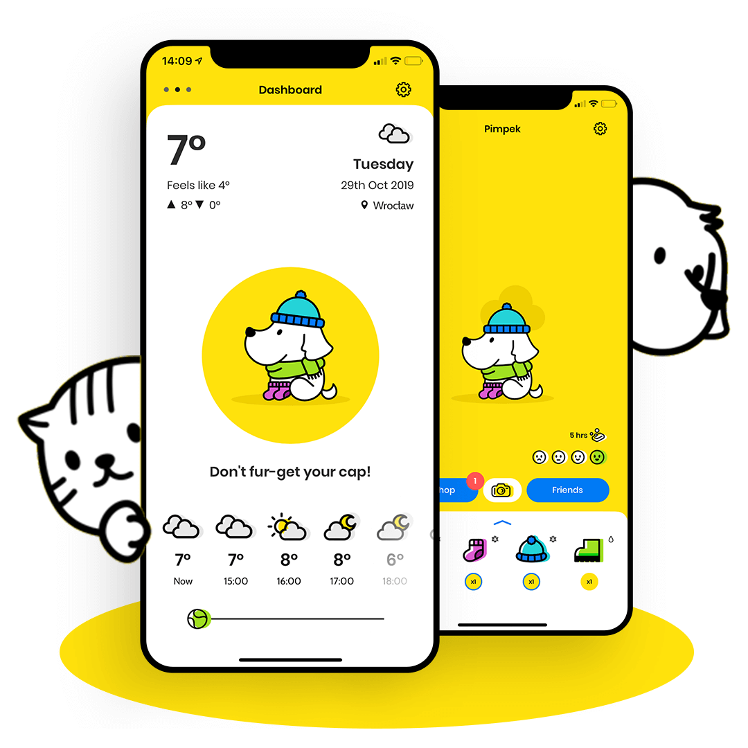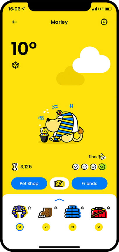First, you need to choose between a dog and a cat – both impawsibly cute – and name your pet. Then, enable location services on your smartphone or add your location manually – and you’re all set! From now on, you’re responsible for assuring that your pet is happy – that means, dressed appropriately for the current weather in your area. A sombrero for a sunny day, an umbrella when it rains, a warm scarf when it gets windy... And it doesn’t end there!